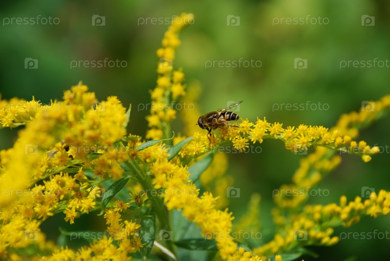 Насекомые на канадском золотарнике. Золотарник канадский цветет множеством маленьких ярко-желтых цветков. Черно-желтая пчела ползет по цветам и собирает нектар