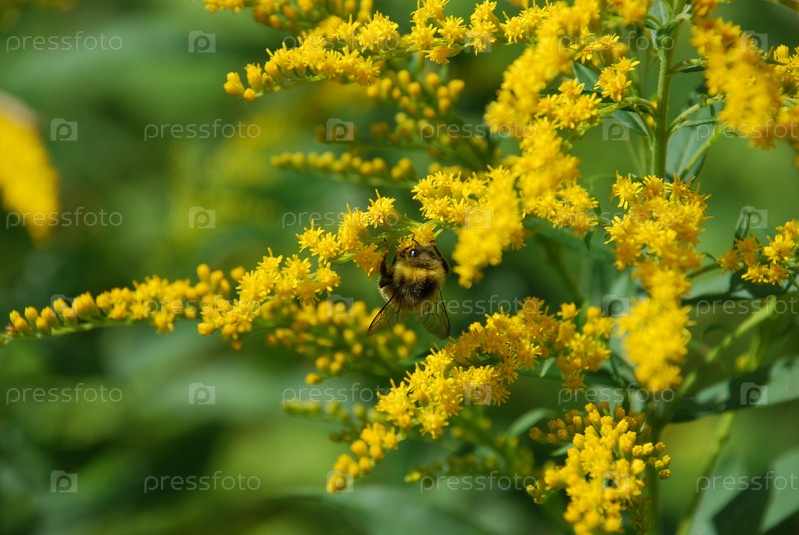 Насекомые на канадском золотарнике. Золотарник канадский цветет множеством маленьких ярко-желтых цветков. Черно-желтая пчела ползет по цветам и собирает нектар
