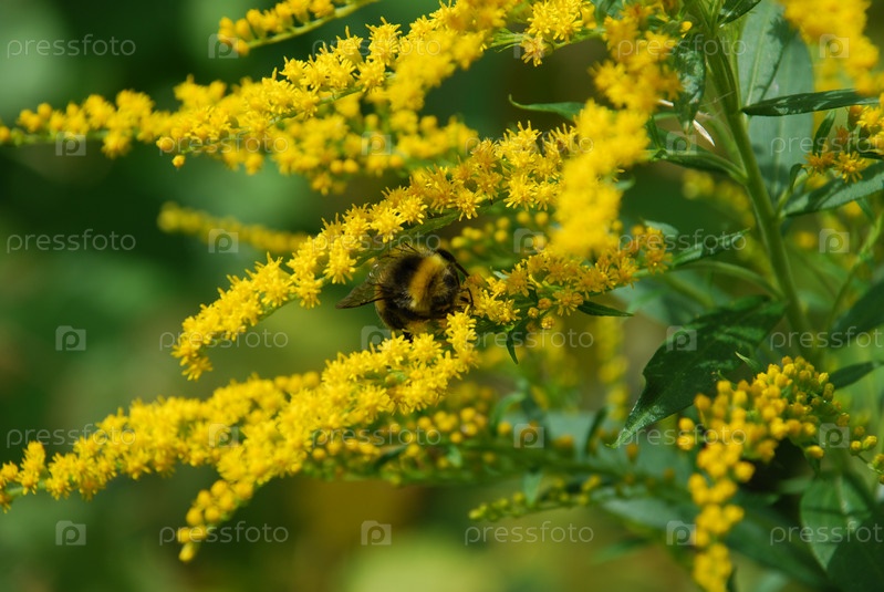 Насекомые на канадском золотарнике. Золотарник канадский цветет множеством маленьких ярко-желтых цветков. Черно-желтая пчела ползет по цветам и собирает нектар