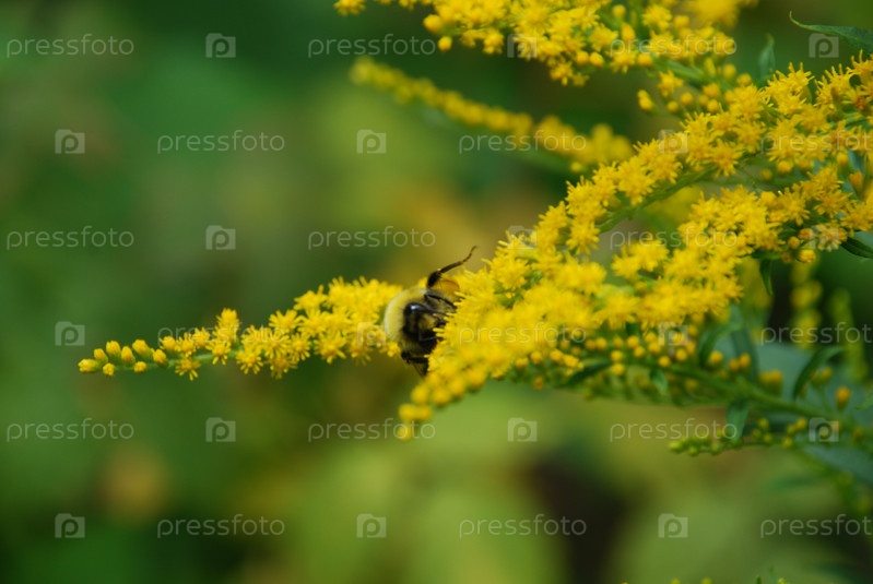 Насекомые на канадском золотарнике. Золотарник канадский цветет множеством маленьких ярко-желтых цветков. Черно-желтая пчела ползет по цветам и собирает нектар
