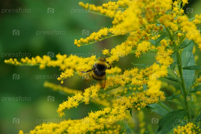 Насекомые на канадском золотарнике. Золотарник канадский цветет множеством маленьких ярко-желтых цветков. Черно-желтая пчела ползет по цветам и собирает нектар
