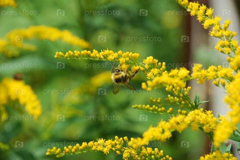 Насекомые на канадском золотарнике. Золотарник канадский цветет множеством маленьких ярко-желтых цветков. Черно-желтая пчела ползет по цветам и собирает нектар