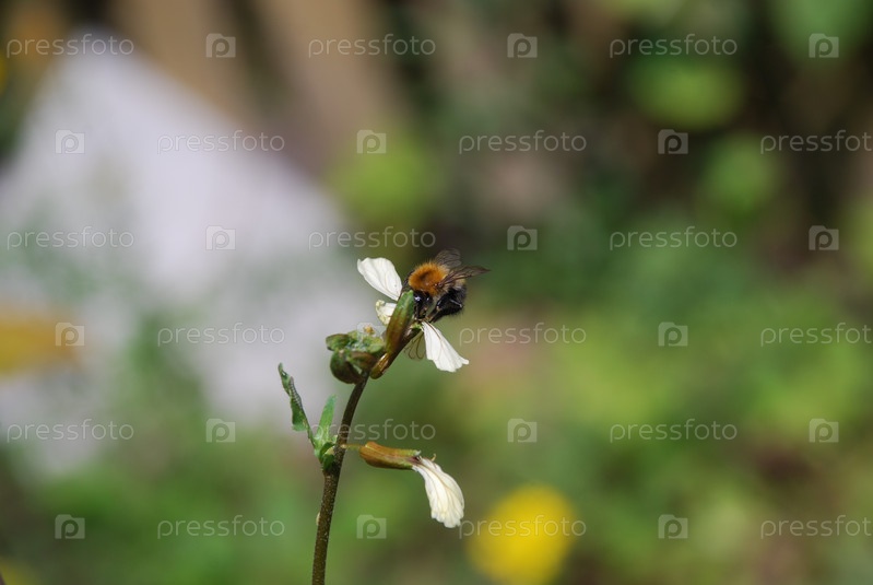 Шмель сидит на белом цветке. На тонком стебле среди травы растет небольшой белый цветок с четырьмя лепестками. Волосатый черно-желтый шмель сидит на цветке и собирает из цветка нектар