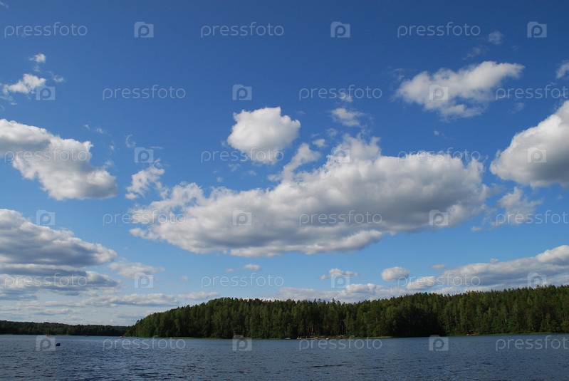 Красивый пейзаж облаков над озером. Над лесным озером, берега которого поросли зелеными деревьями и кустарниками, величественно плывут большие кучевые бело-серые облака