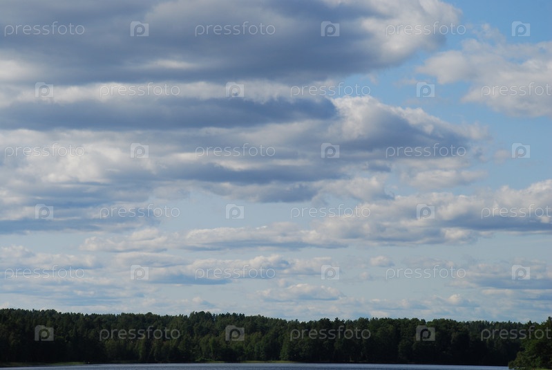 Красивый пейзаж облаков над озером. Над лесным озером, берега которого поросли зелеными деревьями и кустарниками, величественно плывут большие кучевые бело-серые облака