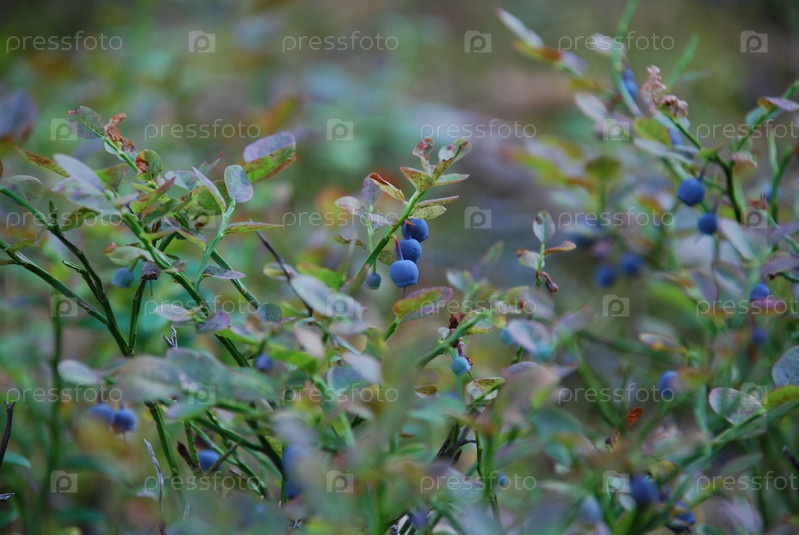 Темно-синяя черника на кусте. На кусте черники с зелено-красными овальными листьями висит несколько круглых маленьких синих ягод. На земле растет мох, лежат опавшие сосновые иголки