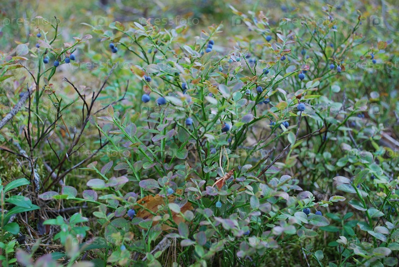 Темно-синяя черника на кусте. На кусте черники с зелено-красными овальными листьями висит несколько круглых маленьких синих ягод. На земле растет мох, лежат опавшие сосновые иголки