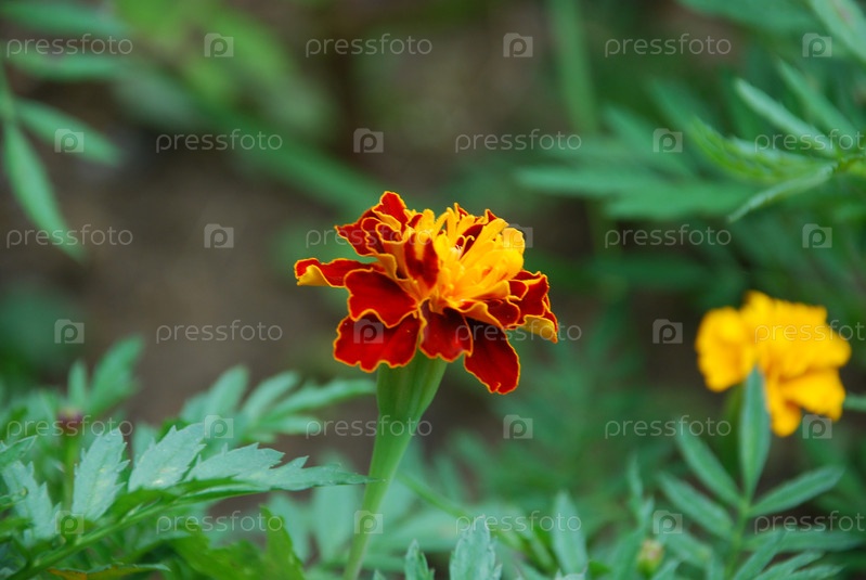 Желтая бордовая маргаритка растет на клумбе