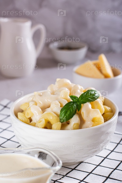 Аппетитные макароны с сырным соусом и базиликом в миске на столе, вертикальный вид