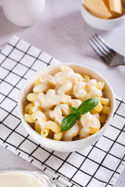 Американская паста в сырном соусе с листьями базилика в вертикальном виде миски