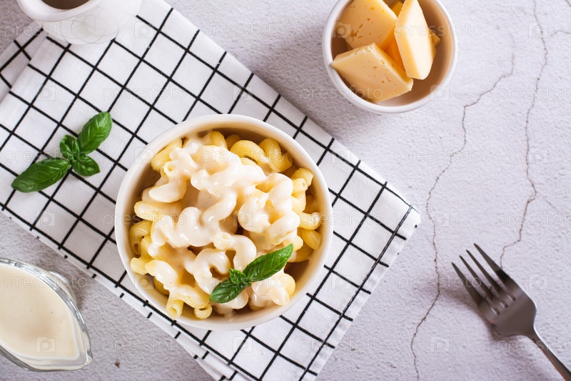 Аппетитная паста с сырным соусом и базиликом в миске на столе