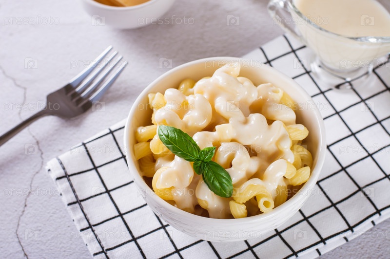 Американская паста в сырном соусе с листьями базилика в миске