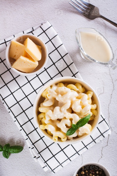 Американская паста в сырном соусе с листьями базилика в верхней части миски и вертикальный вид