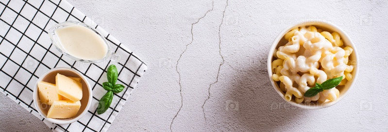 Американская паста в сырном соусе с листьями базилика в миске, вид сверху веб-баннер