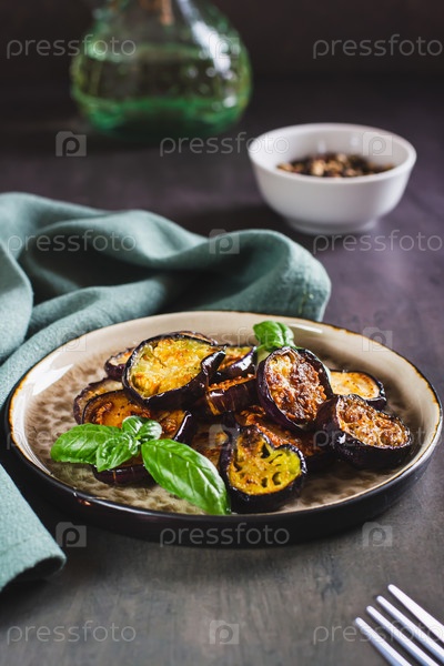 Аппетитные жареные баклажаны со специями и зеленью на тарелке на столе, вертикальный вид