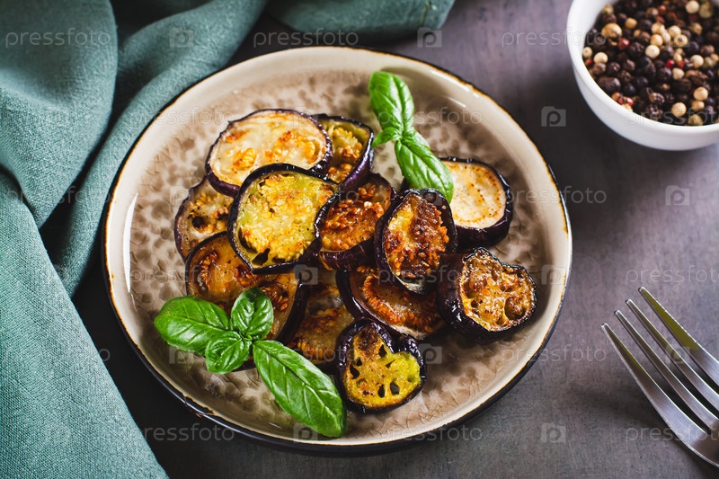 Кусочки жареных баклажанов со специями и базиликом на тарелке на столе