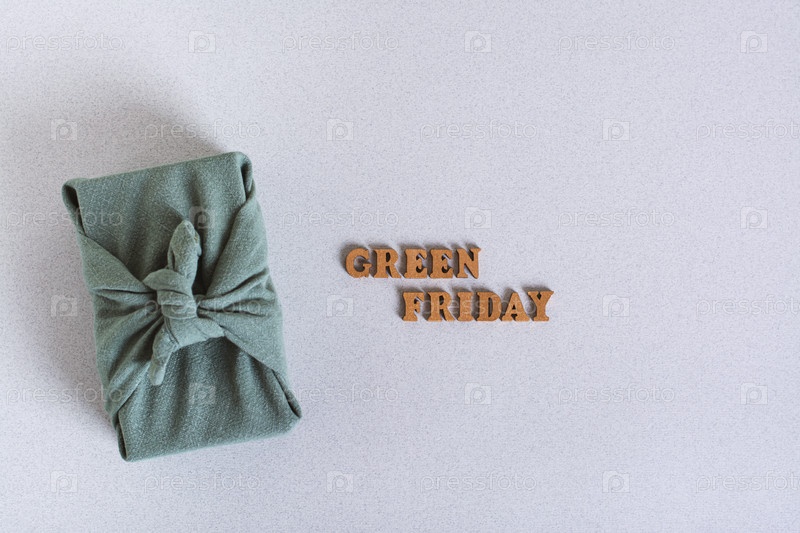 Подарок зеленой пятницы фурошик и надпись на зеленом фоне, вид сверху