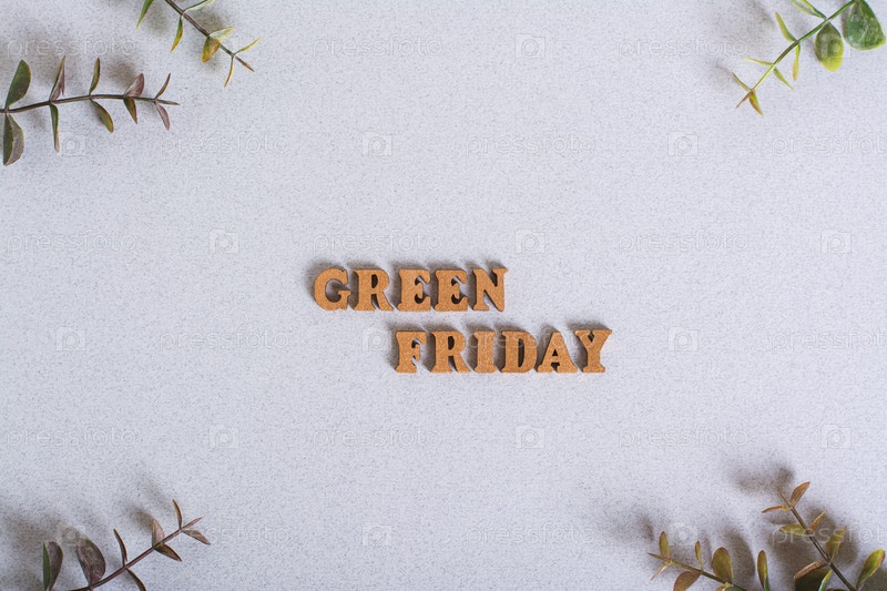 Надпись Зеленая пятница и веточки на зеленом фоне, вид сверху