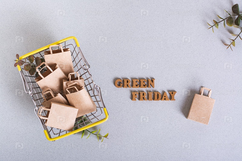 Надпись "Зеленая пятница" и бумажные пакеты в корзине для покупок на зеленом фоне, вид сверху