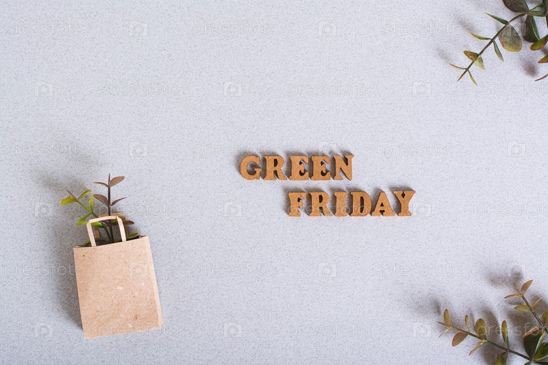 Надпись Зеленая пятница и ветки в бумажном пакете на зеленом фоне, вид сверху