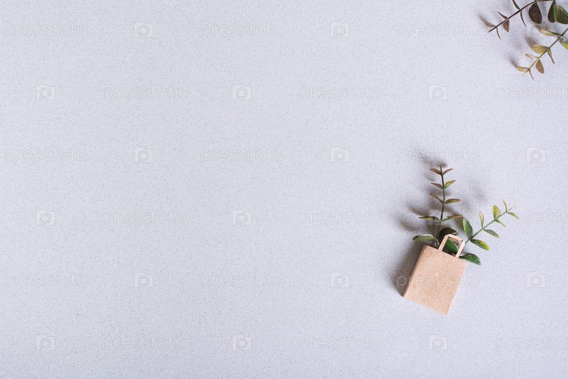 Бумажный пакет "Зеленая пятница" с ветвями на зеленом фоне, вид сверху, пространство для копирования