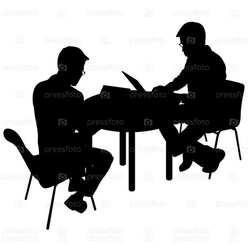Черный силуэт двух мужчин, сидящих за компьютером, на белом фоне