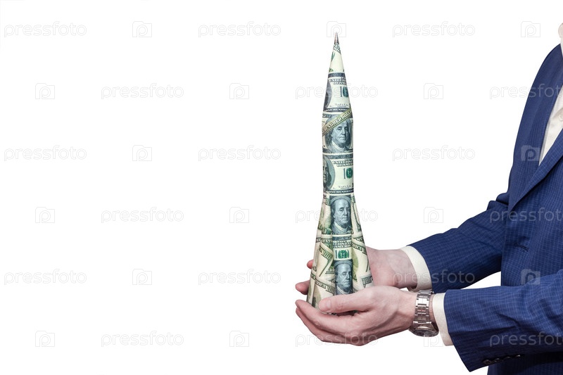 Долларовая ракета в руках мужчины на изолированном белом фоне