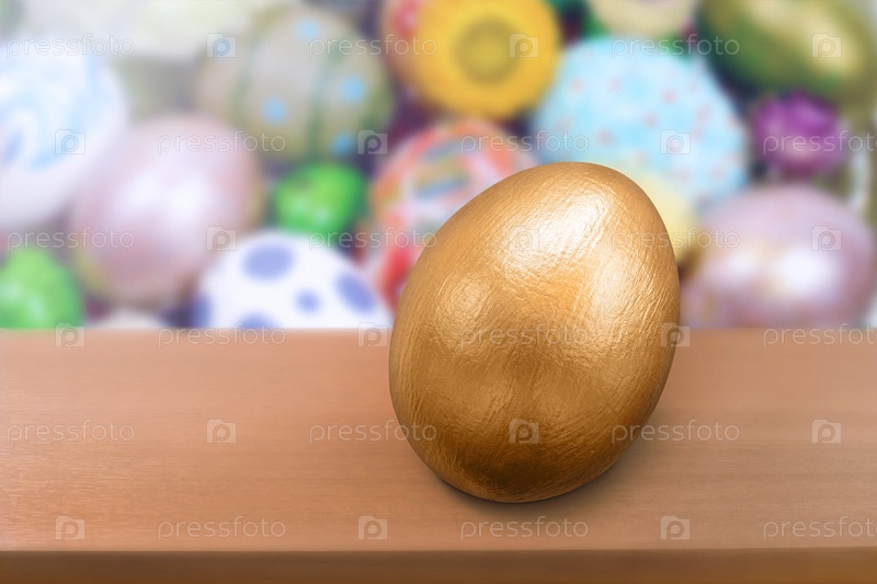 Золотое пасхальное куриное яйцо на столе и на праздничном фоне