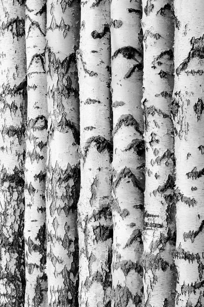Фон из берез, выстроенных в ряд. Пиломатериалы. Шаблон для написания текста. Лесная роща. Аннотация. Черно-белое изображение