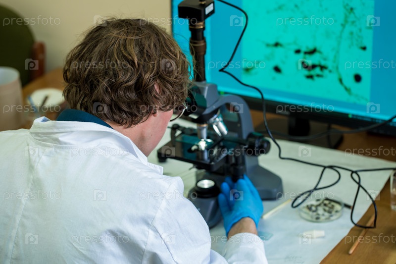 Ученый исследует плесень конопли через электронный микроскоп