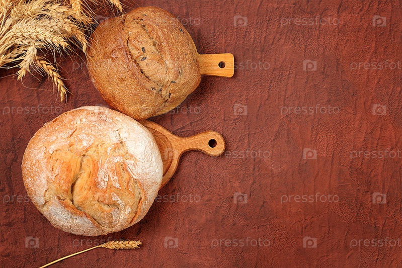 Свежеиспеченный домашний хлеб, круглый хлеб на закваске с хрустящей корочкой и колосьями ржи и пшеницы на бетонном фоне с местом для текста, современная концепция выпечки, здоровая натуральная еда, избирательный фокус