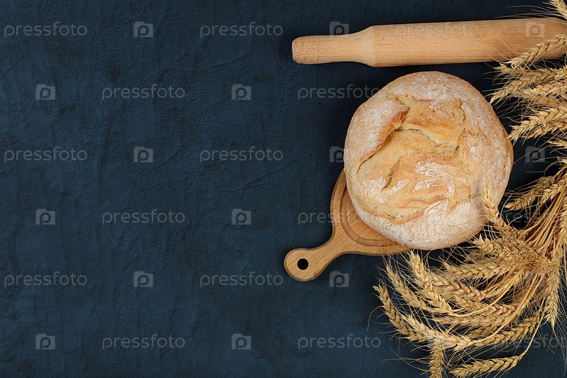 Свежеиспеченный домашний хлеб, круглый хлеб на закваске с хрустящей корочкой и колосьями ржи и пшеницы на бетонном фоне с местом для текста, современная концепция выпечки, здоровая натуральная еда, избирательный фокус