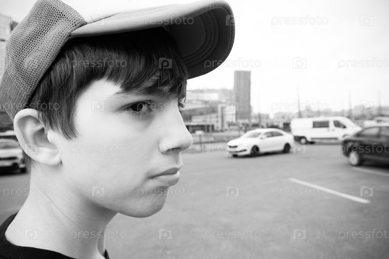 Черно-белый портрет мальчика в кепке на городской улице, крупный план, лицо в профиль