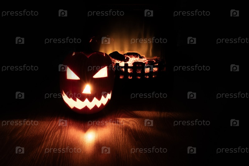 Тыква с лицом Фонарик Джек стоит у камина в темноте, фонарь на Хэллоуин, Jack-o'-lantern