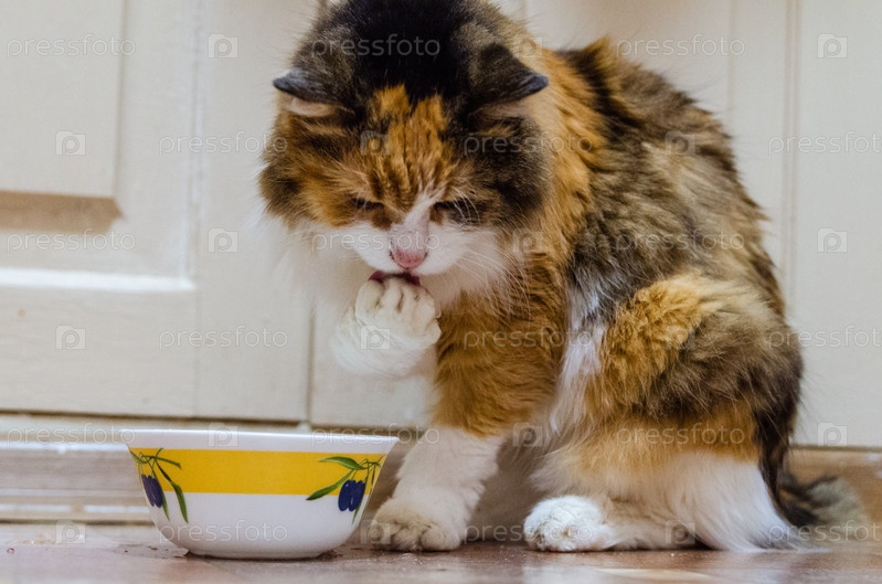 Кошка с поднятой лапой, моет лапу