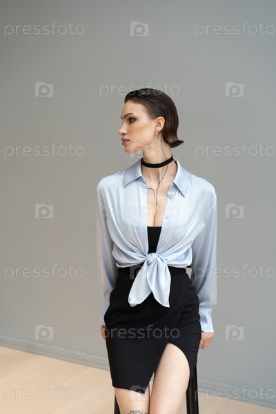 Молодая красивая женщина позирует в синей рубашке в студии