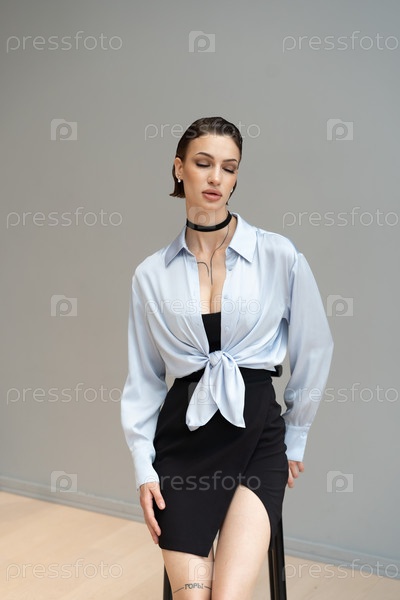 Молодая красивая женщина позирует в синей рубашке в студии