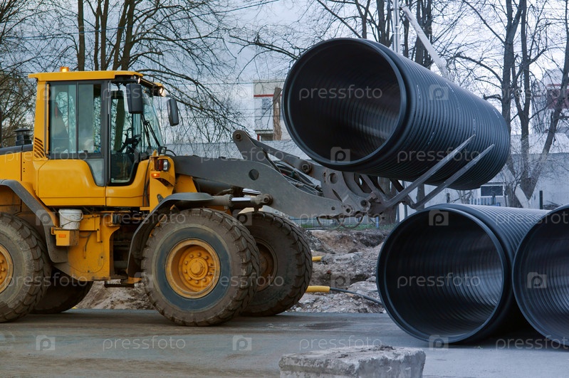 Вилочный погрузчик раздает пластиковые трубы большого диаметра, строительная техника за работой