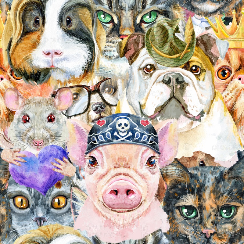 Бесшовный рисунок собаки, морской свинки, кошки, мини-свиньи и крысы. Кошки для графики на футболках. Иллюстрация акварельных домашних животных. Акварель рисованной иллюстрации