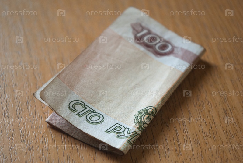 Фотография бумажной сторублевой купюры, российские рубли крупным планом. на столе