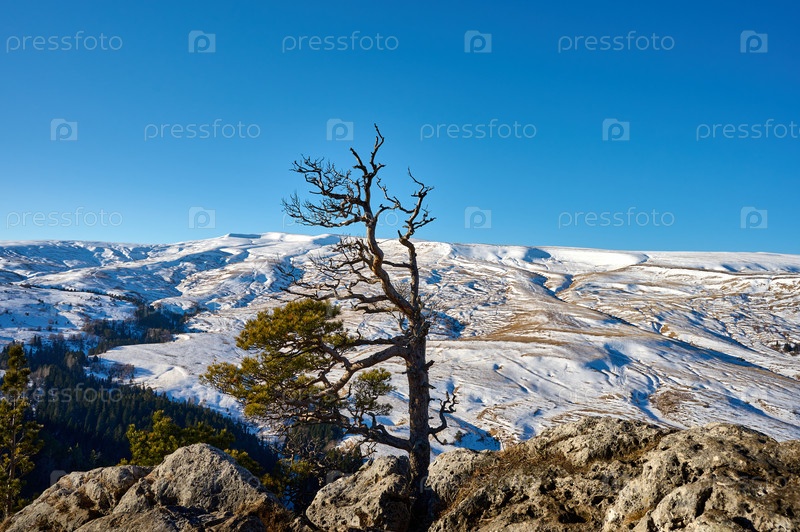 Дерево над скалой на фоне заснеженных гор