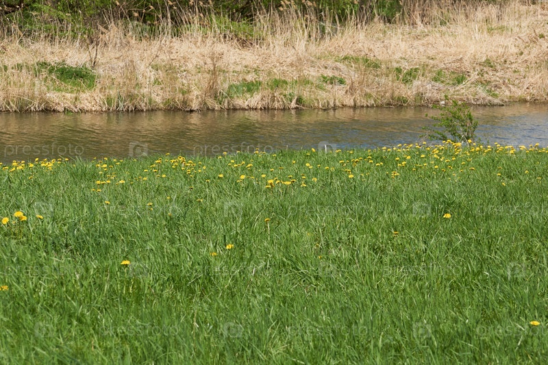 Весна. На лужайке в пойме реки Снежет цветут одуванчики