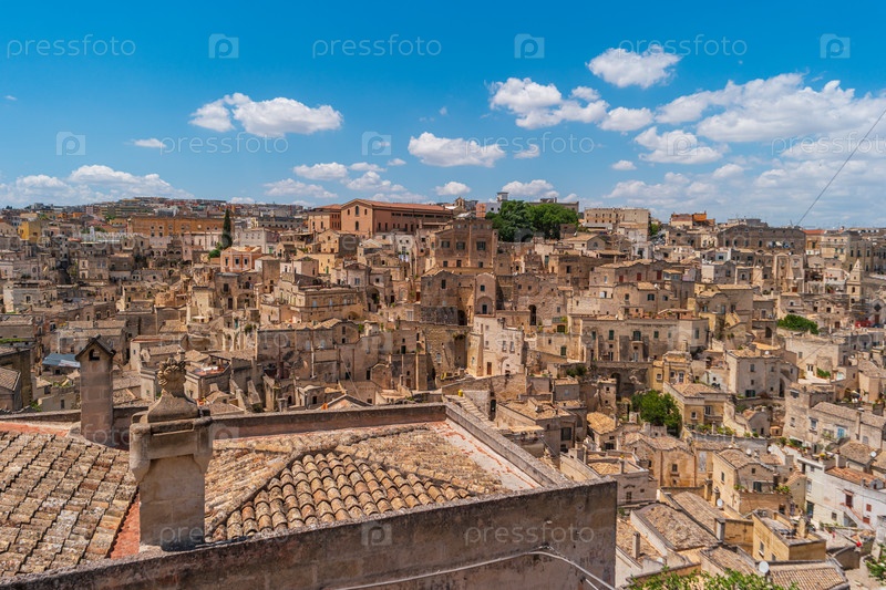 Вид на старый каменный город Матера, Италия. Городской пейзаж в летний день
