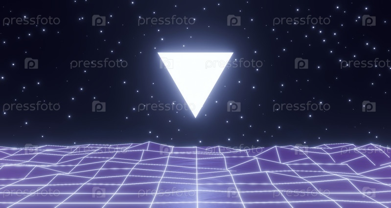 3D-рендеринг, неоновая светящаяся геометрическая форма, ретрокаркасный плакат