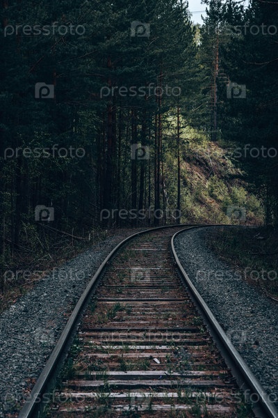 Железная дорога идущая через хвойный лес. Драматичная фото. Вертикальная ориентация