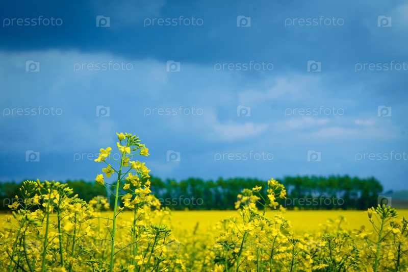 Рапсовое поле, желтые цветы рапса крупным планом на переднем фоне, темное небо с грозовыми тучами на заднем фоне