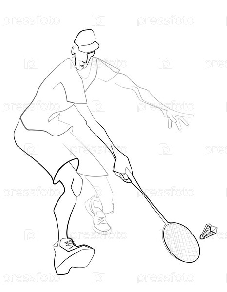 Линейная графика. Мужчина в шляпе играет в бадминтон на белом фоне