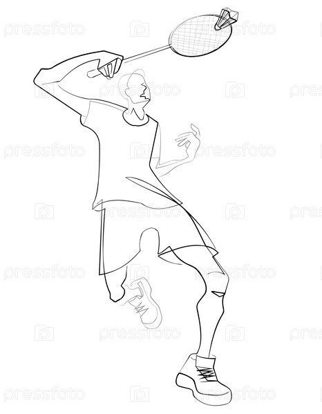 Линейная графика. Мужчина в шляпе играет в бадминтон на белом фоне