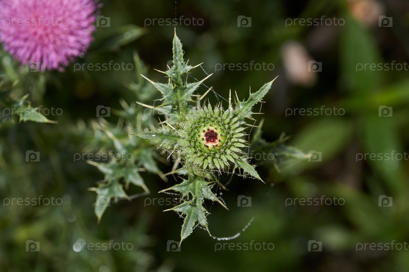 Утренняя роса на соцветиях чертополоха. род растений семейства Сложноцветные, или Сложноцветные Ранним утром на берегу озера