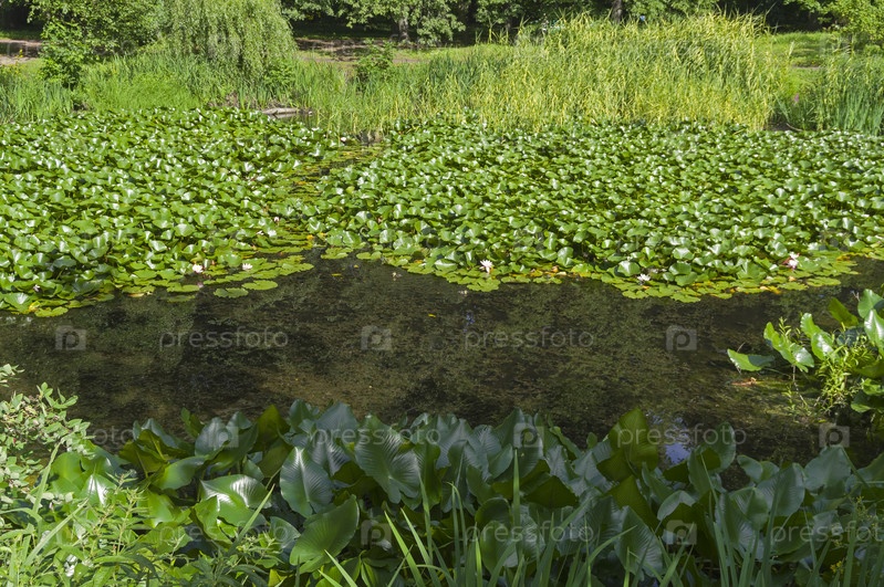 Небольшой пруд, заросший цветущими водными лилиями. Парк ботанического сада, Санкт-Перербург